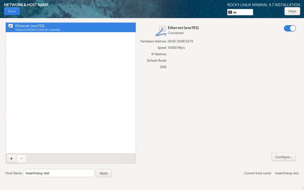 - 네트워크 ON: Minimal 버전은 설치할 때 네트워크를 안 잡으면 나중에 설정 파일 만지기가 꽤 까다롭습니다. **’Network & Host Name’**에서 이더넷을 꼭 ON으로 켜주세요.